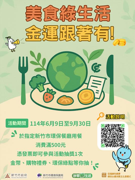 為推廣綠色飲食並支持聯合國永續發展目標SDG12責任消費及生產,新竹市環境保護局將於6月9日至9月30日舉辦「美食綠生活 金運跟著有」活動,邀請全國民眾在日常生活中,實踐綠色飲食行動。環保局表示,民眾只要於活動期間至新竹市轄內指定的114家環保餐廳,消費滿500元並上傳發票或載具證明至活動網站( https://reurl.cc/VYlKeQ ),即可參加抽獎,還有機會獲得金幣、禮券及環保綠點等31項好禮,歡迎踴躍參與,共同響應淨零綠生活守護地球。
