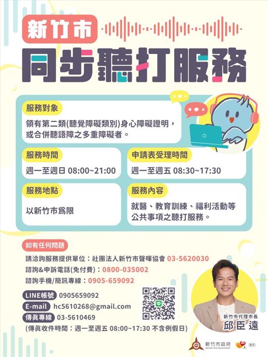 社會處表示,同步聽打服務提供聽語障者就醫、教育訓練、福利活動及參與公共事項等聽打服務,歡迎有需求者,請洽詢本市同步聽打服務提供單位:社團法人新竹市聲暉協會、電話:03-5620030、諮詢手機/簡訊專線:0905-659092、LINE帳號:0905659092,或聯絡社會處身心障礙福利科03-5352386分機503鄭社工。