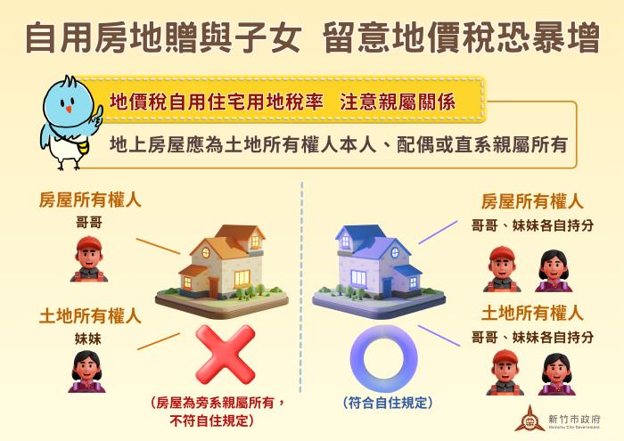 竹科某科技公司退休的高級主管老張,為避免身後需繳納高額遺產稅,規劃提前將房屋及土地分別贈與兒子及女兒,新竹市稅務局提醒,此舉恐省了遺產稅卻因不符合地價稅自用住宅用地優惠稅率規定,反而大幅增加地價稅負擔。