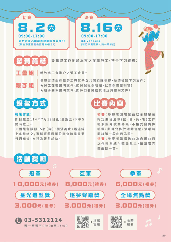勞青處補充,邀請所有熱愛歌唱的勞工朋友與家庭踴躍參與,用歌聲唱出勞動的驕傲與情感,讓音樂成為串連城市人心最動人的旋律。更多資訊請洽新竹市總工會(03-5312124)或藍先生(0922-140280)。