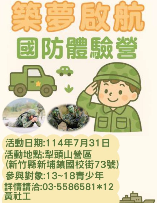新竹縣竹北區社會福利服務中心將於7月31日 (四)上午7時30分至下午4時30分,在位於新埔鎮的犁頭山營區舉辦「築夢啟航-國防體驗營」活動,內容包含挑戰障礙超越、團隊合作等,讓青少年學習有效的溝通技巧與團隊精神,歡迎新竹縣13至18歲的青少年參與,將於7月8日上午8時開放上網報名,限額40名,額滿截止。