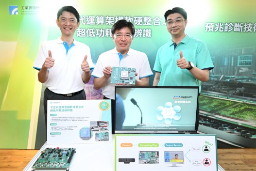 「下世代運算架構軟硬整合之超低功耗邊緣辨識」榮獲傑出研究獎金獎,可突破AI運算耗能瓶頸,省電效能達十倍以上,此晶片特別適用於無人機、機器人等前瞻技術,現已與IC、感測器與半導體廠合作。左起:工研院副總暨電光所張世杰所長、工研院院長劉文雄、工研院電光所組長許世玄。