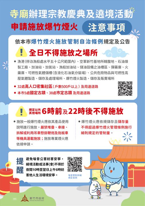 代理市長邱臣遠表示,為確保民眾慶祝節慶及寺廟辦理宗教慶典活動期間遵守爆竹煙火管制措施,市府已將上述管制措施公告、管制區域圖及宣導圖卡函送竹市各寺廟及32個高人口密集社區、43處古蹟,並透過里政系統加強宣導,另於7月3日召開研商會議,決議民政處及警察局受理寺廟申請宗教慶典活動時,由消防局說明管制措施,務必讓寺廟充分了解各項規定,保障慶典活動公共安全。