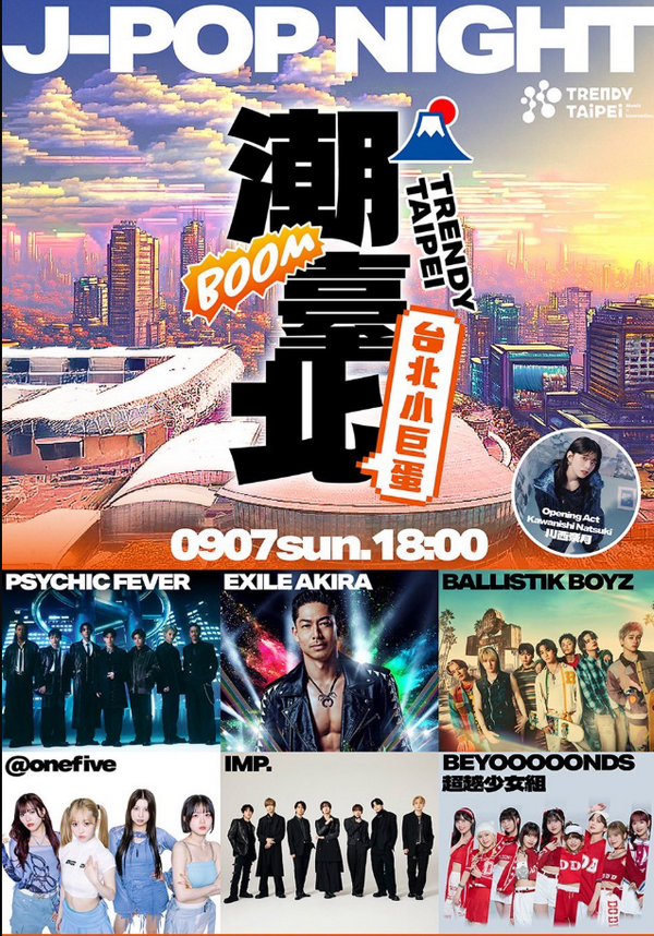 9月7日《J-POP NIGHT》:集結7組⽇本⼈氣全方位藝⼈:川西奈月、@onefive、BEYOOOOONDS、IMP.、BALLISTIK BOYZ、PSYCHIC FEVER與EXILE AKIRA,跨世代卡司連番上陣,打造一夜限定的日系狂潮,已於7月17日 中午 12 點正式開賣。