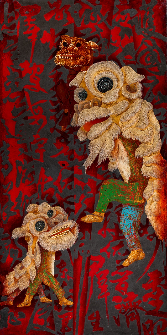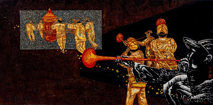 因此,主要以「媽祖」繞境意象為主軸,把所見、所思、所感,加以融合後再行拆解、重構,加上虛實概念的應用,錯置,重疊與空間,並探索線條美感,以漆畫形式來呈現。除了漆的傳統性材料,也應用現代性材料鋁板,來做嘗試與研究。漢文字「形、音、義」三要素中「形」與漢文字的形成,演化上的關係甚為密切。追根溯源,書畫本是同體而未分,因此筆者思考如何在構思時,就把「媽祖」相關文字與圖像做融合,成為畫面中構成的要素,而不只是傳統性落款的呈現,「媽祖」信仰從明朝永樂皇帝開始的封號「護國庇民」,直到清朝同治年間加封「嘉祐」,累積歷朝總共有62字的封號。因此思考如何把文字與圖像也就是書畫,做融合性的構成,也是此系列重要的創作嘗試。