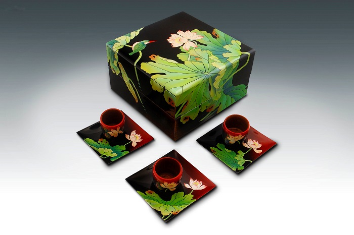 2008 臺灣工藝競賽 創新組 佳作〈品茗賞荷〉漆器一組7件 媒材:天然漆、腰果漆、木胎、竹胎、金屬胎 24×24×13.5cm / 2008 年