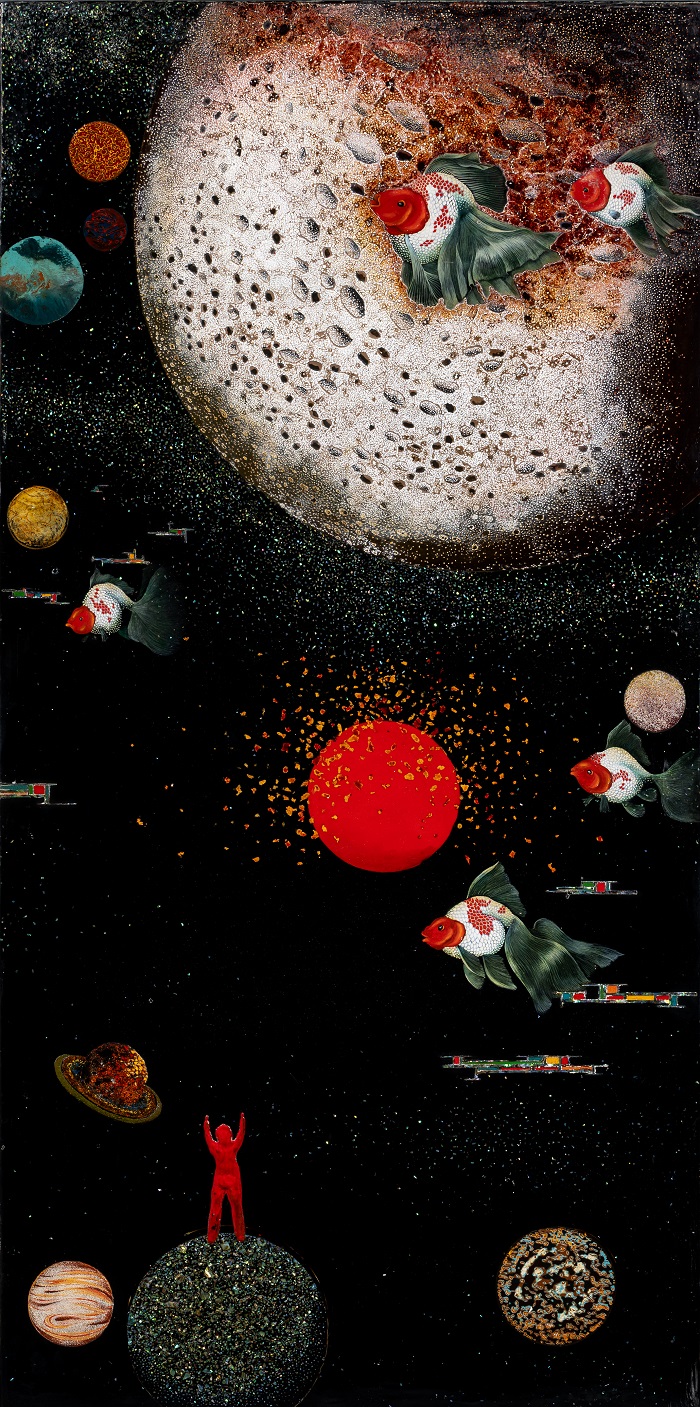 2023 第一屆「臺灣工藝獎」 入選〈生命‧水Ⅰ〉 媒材:天然漆、貝殼、蛋殼、金箔、乾漆粉、乾漆皮、木板、布 120×60cm / 2023 年