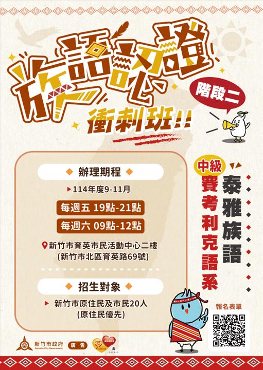 民政處說明,此次衝刺班課程自9月5日起 至11月29日止,採一週兩日方式進行,課程安排於每週五19時至21時及週六9時至12時,充分利用平日晚間與週末時間,讓上班族及在學族人皆能安心參與、不受日常作息影響。採線上報名方式(網址https://reurl.cc/x39Vye 或是掃描宣傳海報QR code 報名),如有疑問請電洽新竹市政府原民科(03-5216121分機231 胡小姐),邀請族人朋友踴躍報名參加,共同投入族語學習與傳承,為語言永續而努力。