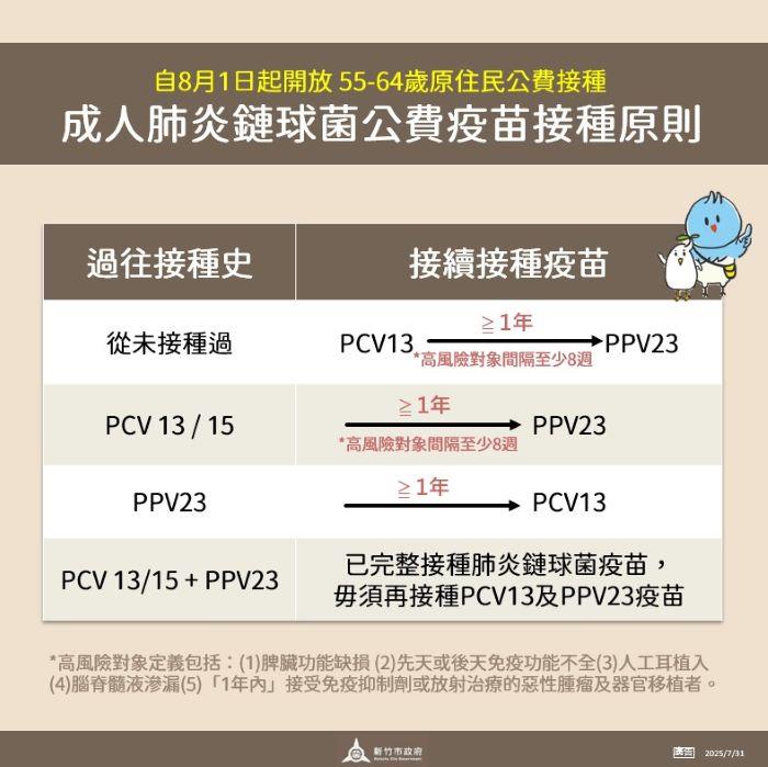 衛生局提醒,55-64歲原住民自8月1日起可公費接種肺炎鏈球菌疫苗,請備妥健保卡及原住民身分證明文件(戶口名簿或戶籍謄本)前往接種,以維護自身權益。請符合資格市民可依下列接種原則與自己的過往接種史接種: