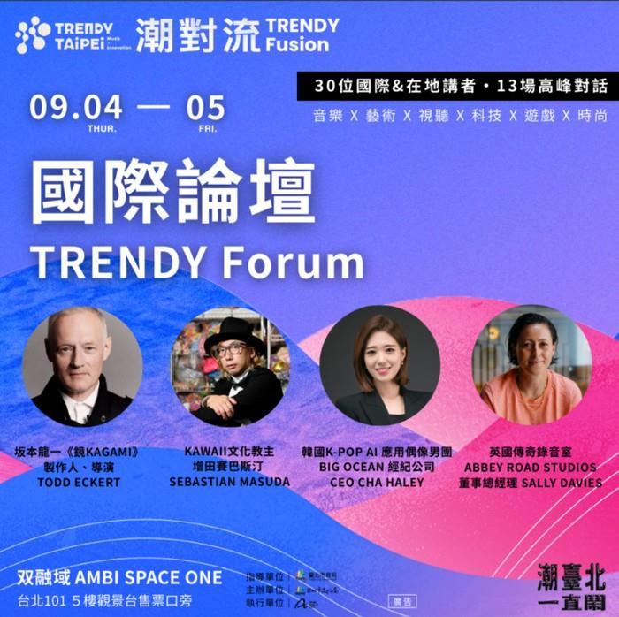 2025潮臺北 TRENDY TAIPEI《潮對流|國際論壇》將於9月4日至5日於台北101双融域 AMBI SPACE ONE隆重登場,邀請來自英、美、日、韓四位重量級講者齊聚,分別為英國殿堂級錄音室Abbey Road Studios董事總經理Sally Davies、曾與音樂大師坂本龍一共同創作,來自紐約的製作人暨導演Todd Eckert、卡莉怪妞藝術總監增田賽巴斯汀(Sebastian Masuda)、韓團Big Ocean 經紀公司執行長Cha Haley,帶來跨越藝術、音樂、時尚到科技的精彩對話。論壇皆為免費報名,歡迎一同深入探討文化與科技的跨界對話與未來發展,透過國際觀點,展現臺灣作為亞洲創意匯流中心的重要地位。