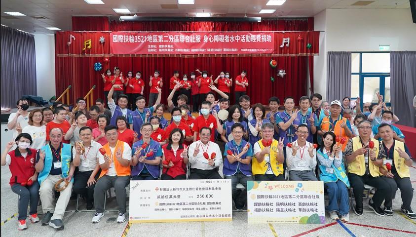 躍齡扶輪社主辦「國際扶輪3521地區第二分區聯合社服 身心障礙者水中活動經費捐助」,邀請陽明、百齡、福齡、陽星、華齡等扶輪社協辦,捐助新台幣25萬元-新竹市天主教仁愛基金會提供