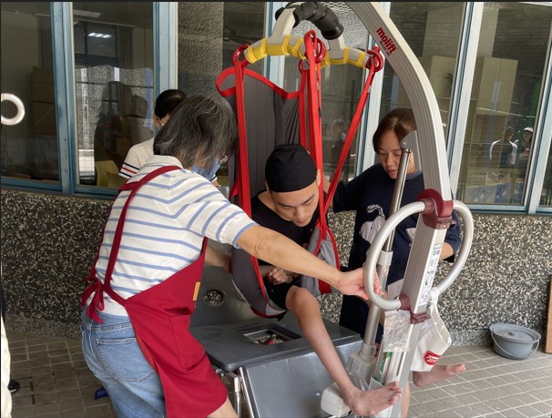 教保員(左)使用落地式移位機協助服務對象(中)安全進入水池-新竹市天主教仁愛基金會提供