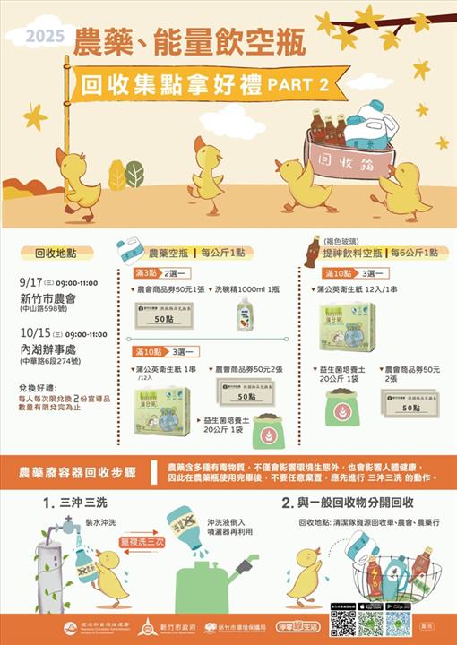 新竹市環保局推動秋季農藥空瓶及提神飲料玻璃空瓶回收活動,將於今(114)年9月17日及10月15日9時至11時,分別在新竹市農會及內湖辦事處舉辦。環保局表示,活動當日民眾凡攜帶農藥空瓶或褐色玻璃提神飲料空瓶,依重量累計點數,即可兌換農會商品券、清淨海洗碗精1,000ml、益生菌培養土20kg、蒲公英衛生紙等多項好禮,更首次結合「風收站APP」智慧集點系統,讓兌換流程更便捷,此舉不僅落實淨零綠生活理念,也鼓勵民眾妥善回收,避免污染環境,促進資源循環再利用。