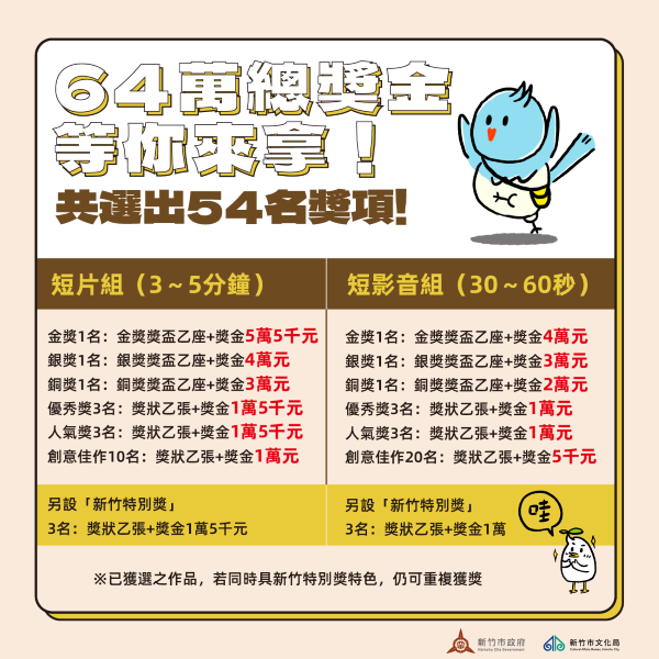 文化局表示,此次競賽分為「短片組」(3至5分鐘)及「短影音組」(30至60秒),採取線上「先報名、後繳件」的方式進行。參賽作品須於影片中置入165反詐專線及110報案專線,並融入警察局推動的「犯罪預防宣導20招」內容。今年更特別增設「新竹特別獎」及「網路人氣獎」,總計將頒發54個獎項,不限年齡與國籍,期盼吸引更多創作者參與,讓優秀作品有機會被更多人看見。