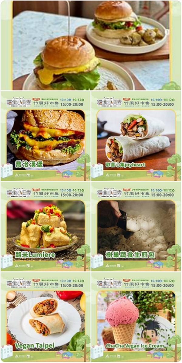 城銷處說明,第四週「輕食小日常」將於10月10日至12日,每日15時至20時在竹市護城河畔(勝利路及信義路段)登場。活動集結超過40個特色品牌,推出多樣化的蔬食料理與療癒美食,特別邀請知名的素食小夜市領軍,帶隊人氣餐車進駐,包括喬治漢堡、Anjali植物飲食瑜伽聚落的能量輕食手作、Chacha Vegan IceCream 的沁涼純植冰淇淋,以及 Vegan Taipei 的墨西哥起司餡餅與捲餅,帶來豐富的味覺驚喜。