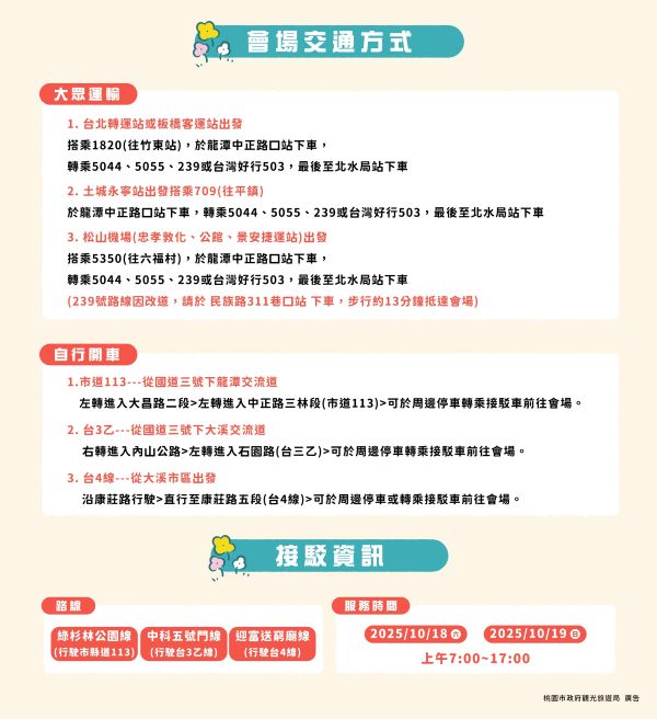 因應活動會場週遭管制且停車空間有限,桃市府規劃「 綠杉林公園線(行駛市縣道113)*」、「 中科五號門線(行駛台3乙線)」及「 迎富送窮廟線(行駛台4線)」三條接駁路線,其中「綠杉林公園線(行駛市道113)」由「龍潭綠杉林公園停車場」出發沿途停靠「客家文化館」後再前往會場,建議由國道三號龍潭交流道前往的民眾可多利用;「中科五號門線(行駛台3乙線)」由「中科院龍門院區五號門」沿石園路出發,民眾可於石園路兩側路邊停車,在「皇家社區公車站牌」以及「淮子埔公車站牌」轉乘接駁車前往,經國道三號大溪交流道的民眾可多多利用;另外「迎富送窮廟線(行駛台4線)」將由「迎富送窮廟停車場」出發,沿途停靠「十一份活魚餐廳」以及「桃禧漫遊露營區」前往會場,由大溪台4線前往之民眾可轉乘前往,各路線自上午7:00開始行駛,班次間隔約15至20分鐘,尖峰時刻滿座即出發,請大家多多利用。