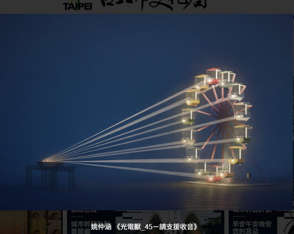 《光電獸#45-請支援收音》呼應場域中曾經洋溢的遊樂場氛圍,簡單的動作形同自發的邀請,觸發民眾潛藏的玩心,聲聲相連,喚醒這座在河畔沈睡已久的摩天輪,當燈光逐一亮起,也重現屬於我們的童年回憶。