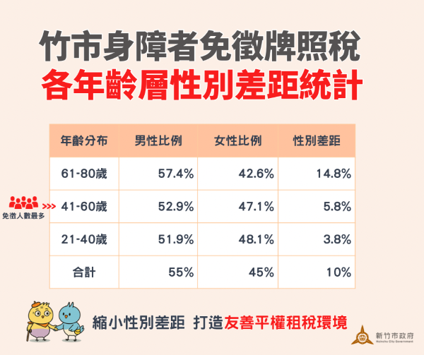為保障身心障礙者權利,根據《使用牌照稅法》第7條規定,身障者享有使用牌照稅減免優惠,每人以一輛為限。新竹市稅務局為了解竹市身障者免徵牌照稅情形,從性別及年齡層分布面向進行分析,113年免徵人數10,889人,男女比例分別為55%與45%,其中又以41至60歲年齡層人數最多,占51.2%。
