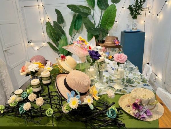 蔣育鳳老師是匯客市藝文設計中心的主人,推廣花藝美學不遺餘力,此次主題展她帶領新瓦屋花藝設計班的學員,將繽紛花卉化為創作靈感,讓帽子成為盛開的花園——每一頂帽子都蘊藏著對自然花卉與對生活的禮讚。