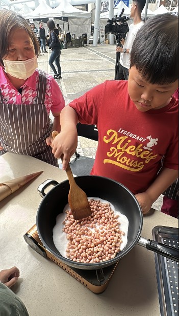 現場還有炒花生D l丫活動,吸引不少民眾直接參與。花生先洗過,先炒塩,再放哦洗好的花生,炒15分鐘冷卻後才可以上鍋放涼才會脆!