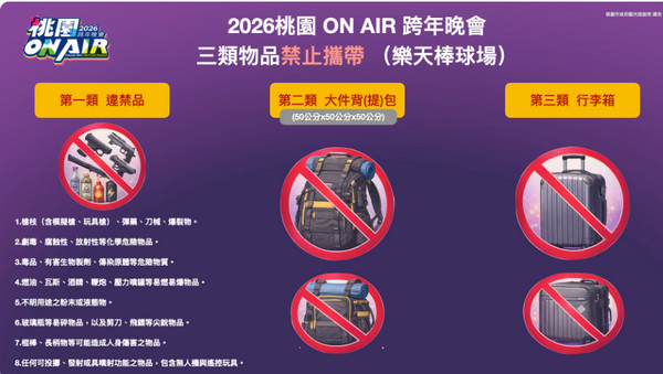 敬請民眾配合安全檢查,並依人潮狀況配合入場管制、禁止進入及引導前往戶外轉播區等相關措施;另為維持進場動線順暢,禁止攜帶違禁品、大型背(提)包及行李箱入場,請盡量輕裝前來參加跨年活動。桃園市政府將在確保安全無虞的前提下,讓市民安心、歡欣參與跨年晚會,共同迎接2026 年的到來。