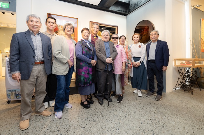 人間國寶、文化人與科技人齊聚一堂,開啟未來跨界合作的新機遇。前排為人間國寶及參展藝術家,由右至左為王賢志、李秉圭、王賢民、張憲平、陳惠美、劉千韶、王峻偉藝師。
