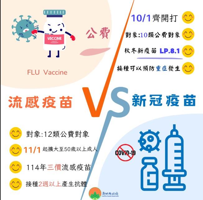 10月1日起公費三價流感疫苗及新冠疫苗同步開打,新竹縣分別有75家合約醫療院所提供成人流感疫苗接種,以及55家提供幼兒流感疫苗接種。流感疫苗與新冠疫苗可同時接種在不同手臂上。新竹縣長楊文科呼籲符合公費