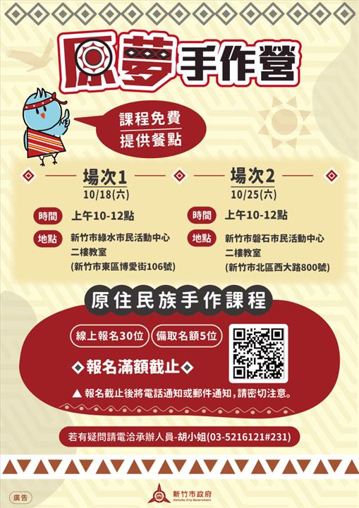 新竹市政府持續推動原住民族多元文化推廣,近年來積極規劃各項語言學習、文化技藝推廣課程,期望傳承傳統文化、拓展族人活動空間。市府將於10月18日及10月25日上午,辦理2場次「原夢手作營」體驗課程,帶領