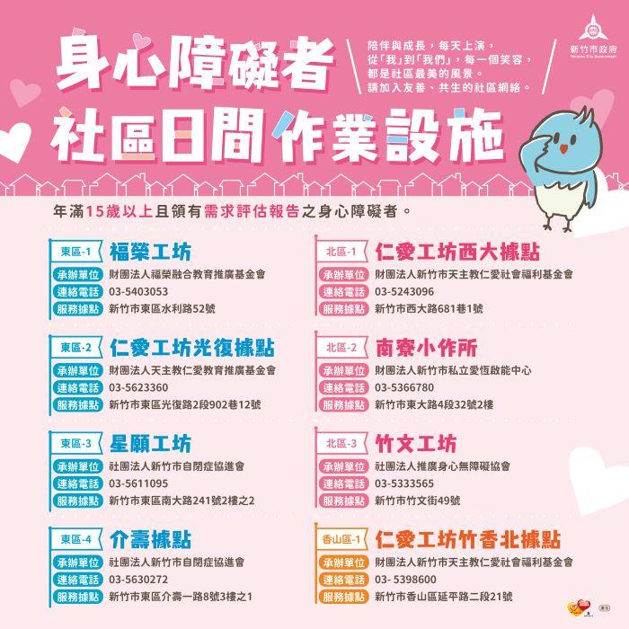 新竹市政府鼓勵身心障礙者融入社區生活、擴展生活經驗,近年來積極布建「社區式日間服務」資源,包含社區式日間照顧服務據點與社區日間作業設施(簡稱小作所)等服務,讓身心障礙者能在熟悉的生活環境中獲得陪伴與照