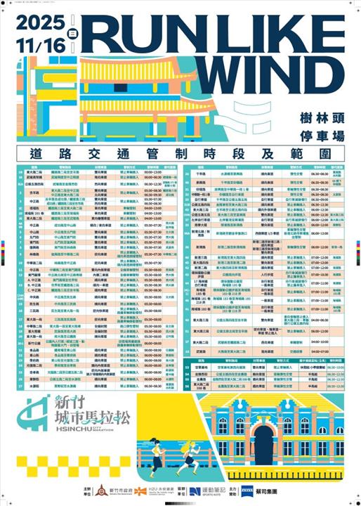 「2025新竹城市馬拉松」將於11月16日在樹林頭公園起跑!今年賽事共有「全馬組」、「半馬組」、「健康樂跑組」、「高級中學競賽組」、「休閒組」與「半馬團體賽」等多組別,吸引全台跑者齊聚風城,用雙腳丈量