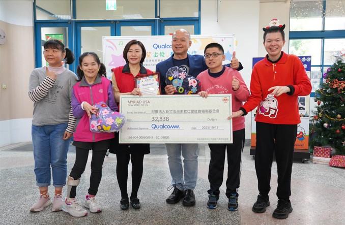 高通副總裁暨台灣、東南亞與紐澳區總裁劉思泰(右3)捐贈美金32,838元支票看板,由仁愛基金會執行長林湘雅(左3)、仁愛學員代表接受,並回贈感謝狀及手作抱枕-新竹仁愛基金會提供新竹市天主教仁愛基金會於