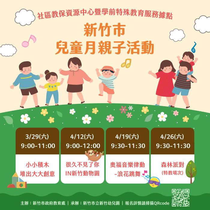 為歡慶兒童月的到來,新竹縣政府社會處透過公私協力合作推出「歡慶兒童月.竹縣童樂趣」系列活動,自4月3日起至30日共舉辦39場活動,包含親職講座、嬰幼兒主題課程、親子童樂會及兒童健康篩檢等活動等,活動不