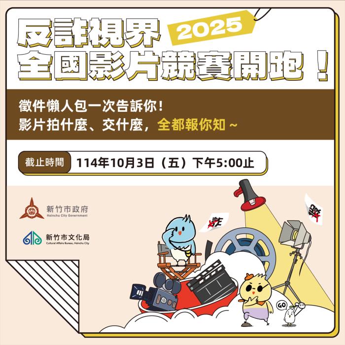 新竹市文化局舉辦的「2025反詐視界-全國影片競賽」徵件活動進入最後倒數,收件將於今(114)年10月3日17時截止。此次競賽總獎金高達新台幣64萬元,共計54個獎項,邀請全國影像創作者、學生團體及社