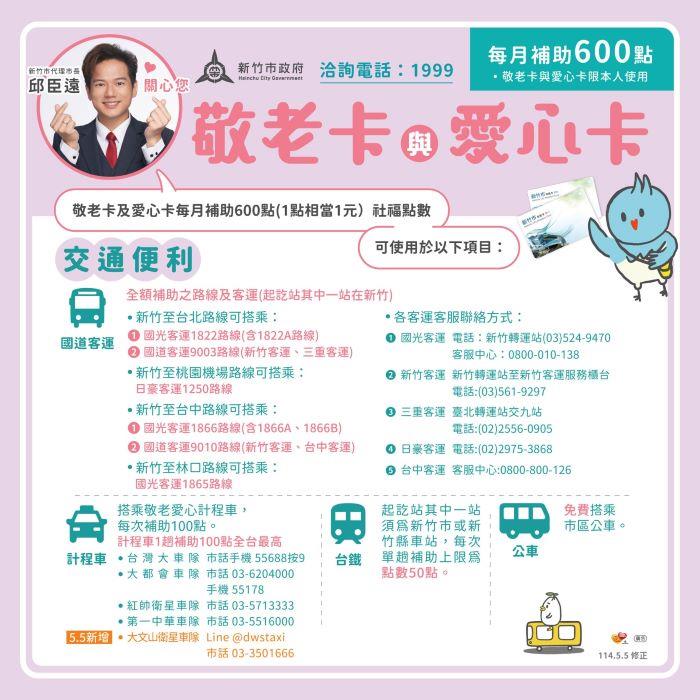 為鼓勵長輩及行動不便縣民走出家門、參與社交,新竹縣政府推出敬老、愛心卡搭乘公車、台鐵、國道客運、計程車,並可用於運動健身,其中111年9月開辦的敬老愛心計程車,因為便利和可及性獲得熱烈回應,2年半以來
