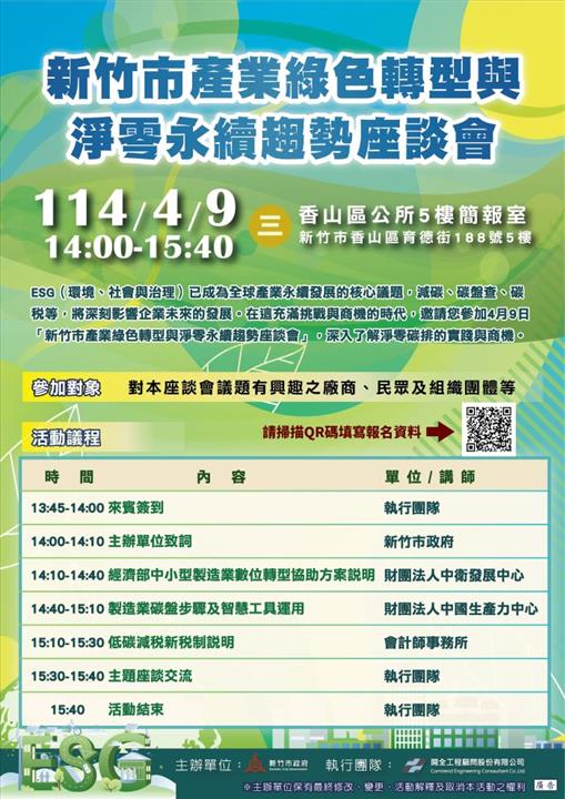 提升竹市產業競爭力!隨著ESG(環境、社會與治理)成為全球產業永續發展的核心議題,減碳、碳盤查與碳稅制度等政策已成為企業未來營運發展的挑戰。對此,新竹市政府將於4月9日在香山區公所舉辦「新竹市產業綠色
