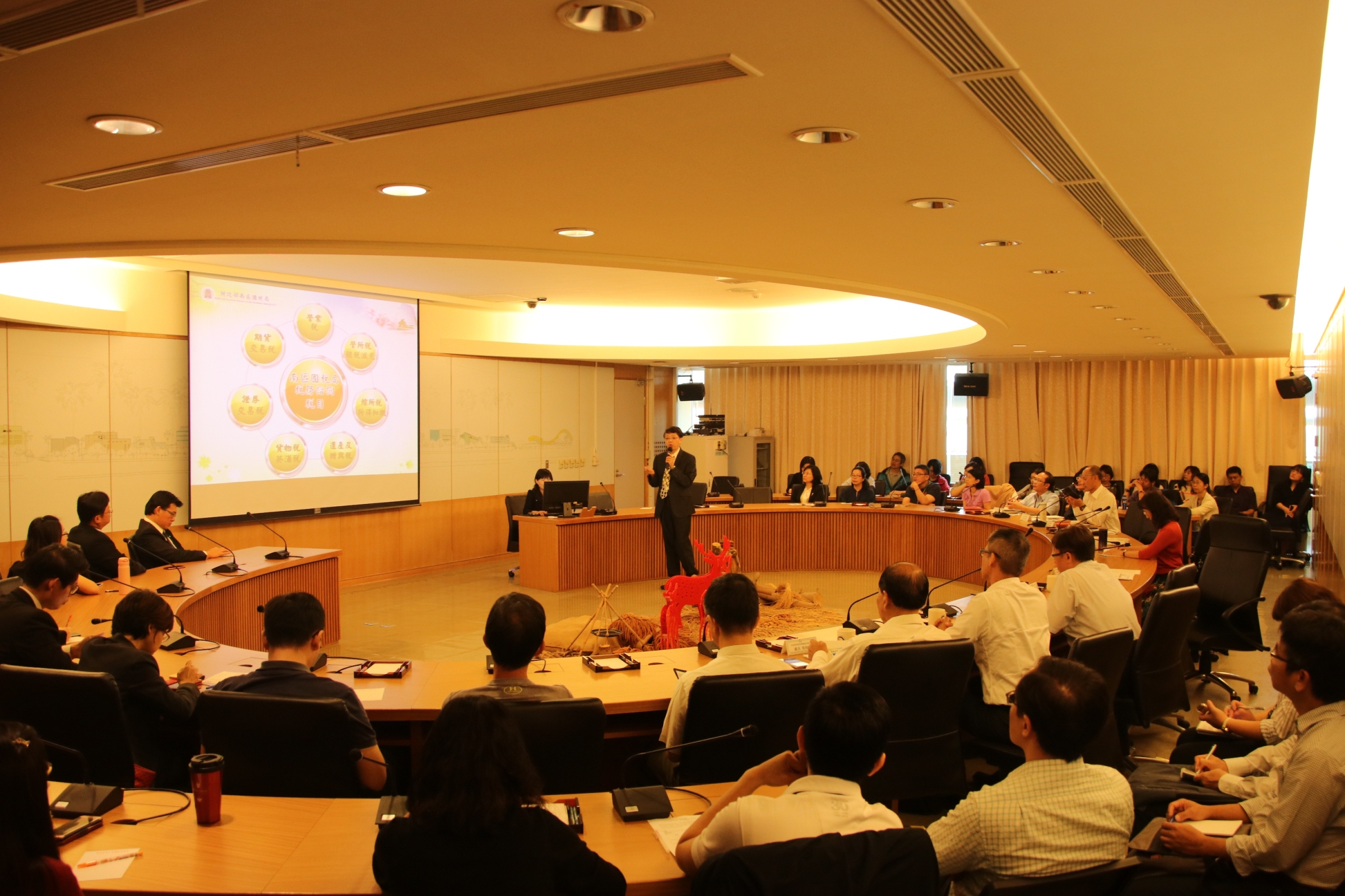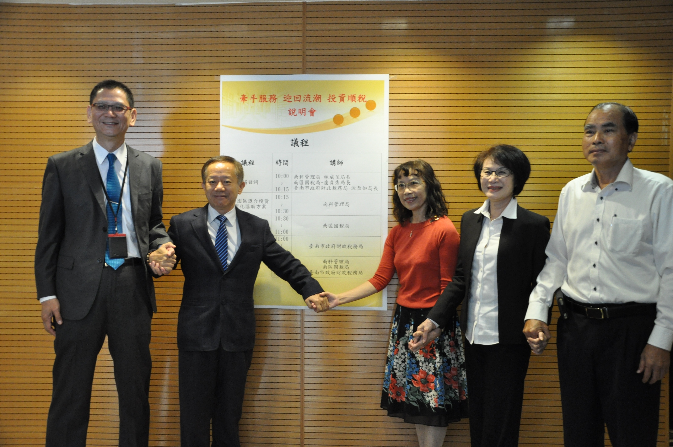 11月6日南科管理局林威呈局長、南區國稅局盧貞秀局長、臺南市政府財政稅務局沈盈如等三位局長聯袂啟動「牽手迎接回流潮,投資順稅沒煩惱」專案小組服務,林局長表示三局一起牽手成立單一窗口解決稅的問題,讓廠商覺得更幸福,為了成功一定要來科學園區投資;盧局長表達三局攜手合作成立單一開放諮詢窗口,透過互動交流,讓廠商投資前瞭解稅務風險,快樂匯回資金投資台灣;沈局長表示台南市全國首創國稅、地方稅合署辦公服務,希望廠商投資順利順稅。今天針對科學園區返台投資客製化協助方案、建廠投資相關稅務說明及地方稅投資優惠向現場園區內外25家廠商8大會計師事務所66位代表說明與座談,期共同建立投資、稅務諮詢平台,讓廠商投資台灣,將可一路順「稅」,衝出好業績。