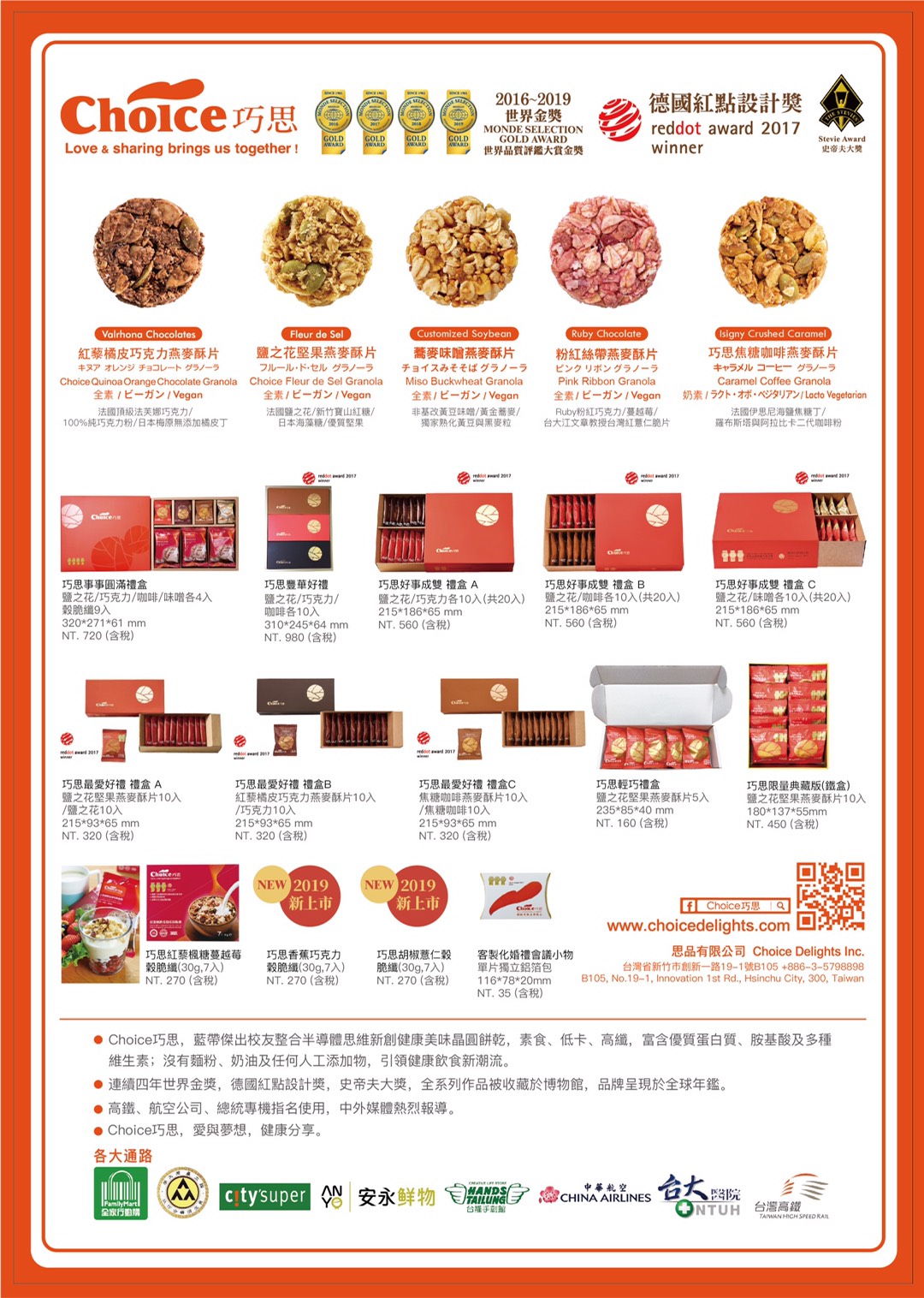 Choice巧思2019蟬聯4年連續榮獲世界品質評鑒大賞金獎,並獲德國紅點設計獎、美國史帝夫大獎;一塊來自臺灣的晶圓餅乾,囊獲國際食品界、設計界及商業界的三項奧林匹克大獎,受邀日本知名甜點雜誌Café Sweets、料理通信《The Cuisine Press》、香港JESSICA雜誌封面報導、美國、英國、中國、法國、印尼、菲律賓及眾多臺灣媒體報導,臺灣史上創紀錄榮耀品牌。