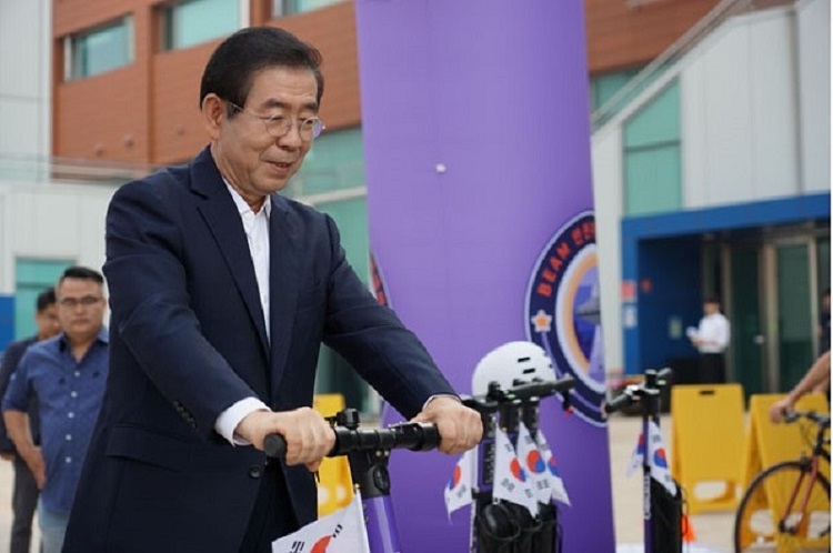 首爾市長朴元淳在首爾創意公園試乘BEAM電動滑板車。圖/BEAM提供