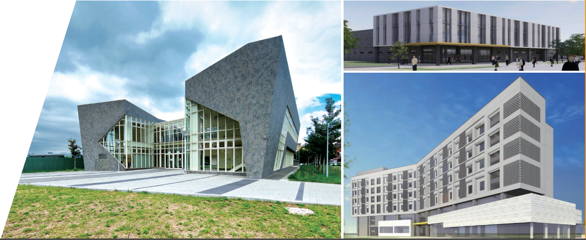 圖依序為已建成的前瞻研發中心(左圖),以及尚未完工的先進產學中心(右上圖,圖為電腦模擬圖)、國際書院(右下圖,圖為電腦模擬圖)。