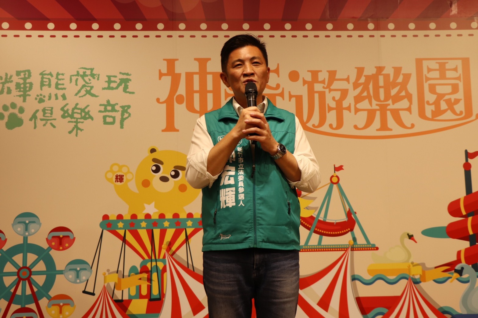 新竹市立委候選人鄭宏輝拚選戰創意新招連連,代言新竹國際青商會主辦的多場親子造勢活動,增加親和力也穩住親子票,本周日將推出大型親子場「神奇遊樂園」,設立多項大型遊具、親子表演、積木、劍玉等體驗教室,並邀請到大小朋友最愛的momo大哥哥大姐姐現場表演,競選吉祥物輝熊更將變身六尺巨人,邀請新竹市所有的親子一同前往,共度快樂的周末親子時光。