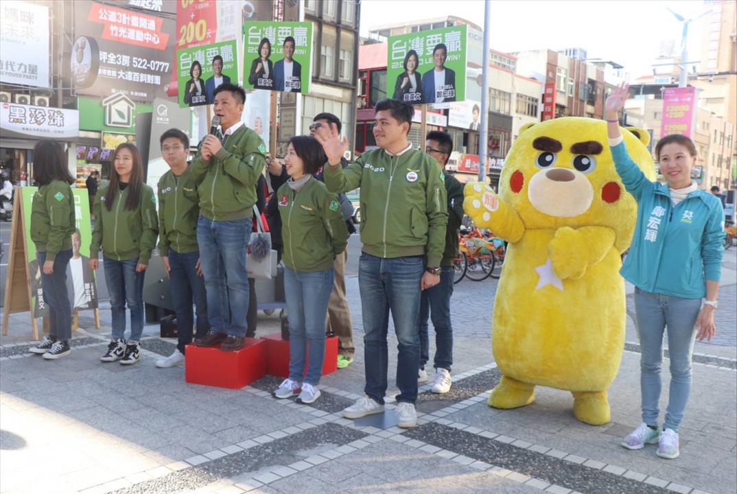選戰進入倒數衝刺期,今日下午新竹市立法委員候選人鄭宏輝,趁著週末假日的好天氣,偕手新竹市民進黨議員一同前往新竹最熱鬧的『巨城百貨』周邊進行宣講,向新竹市的年輕朋友與周邊地區的居民們進行問候。同時也帶著廣受小朋友歡迎的吉祥物「輝熊」一起拜票。