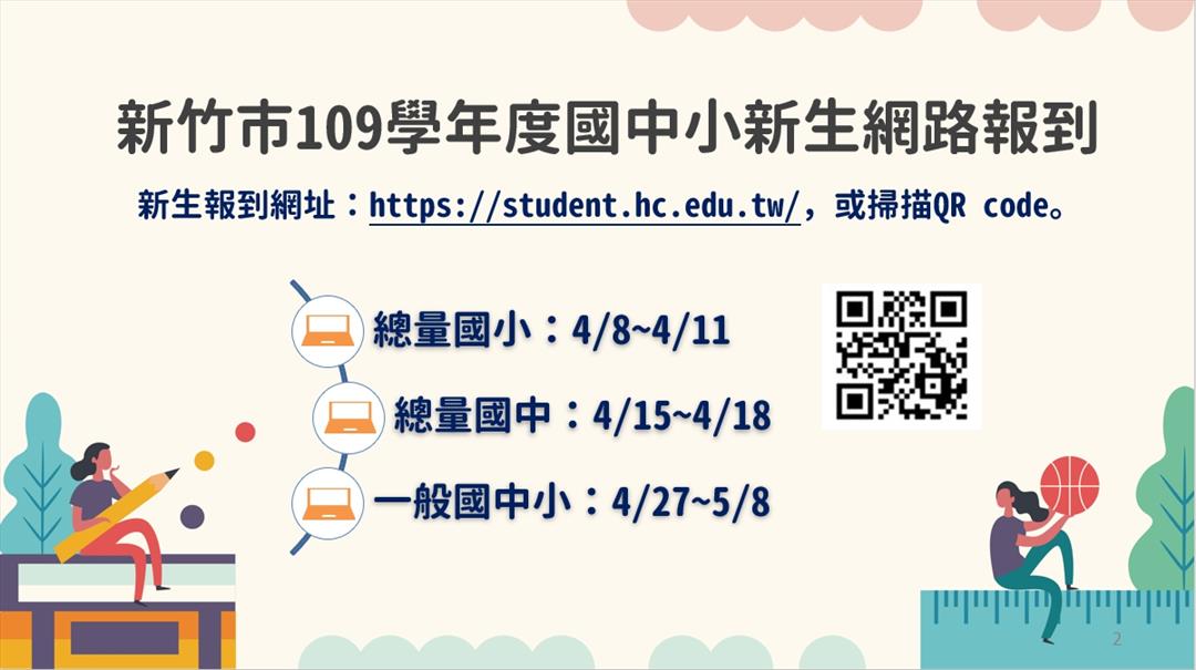 今(109)年的國小新生共計5717人,國中新生亦有5026人,合計共有1萬多名新生即將在5月份辦理入學,教育處表示,為便利家長辦理網路新生報到,故將作業期程延長,總量國小報到期程自4月8日起到4月11日,總量國中自4月15日起到4月18日;一般國中小學報到亦自4月27日開放至5月8日,請家長儘量利用網路進行報到。新生入學通知單將於4月中旬發送。