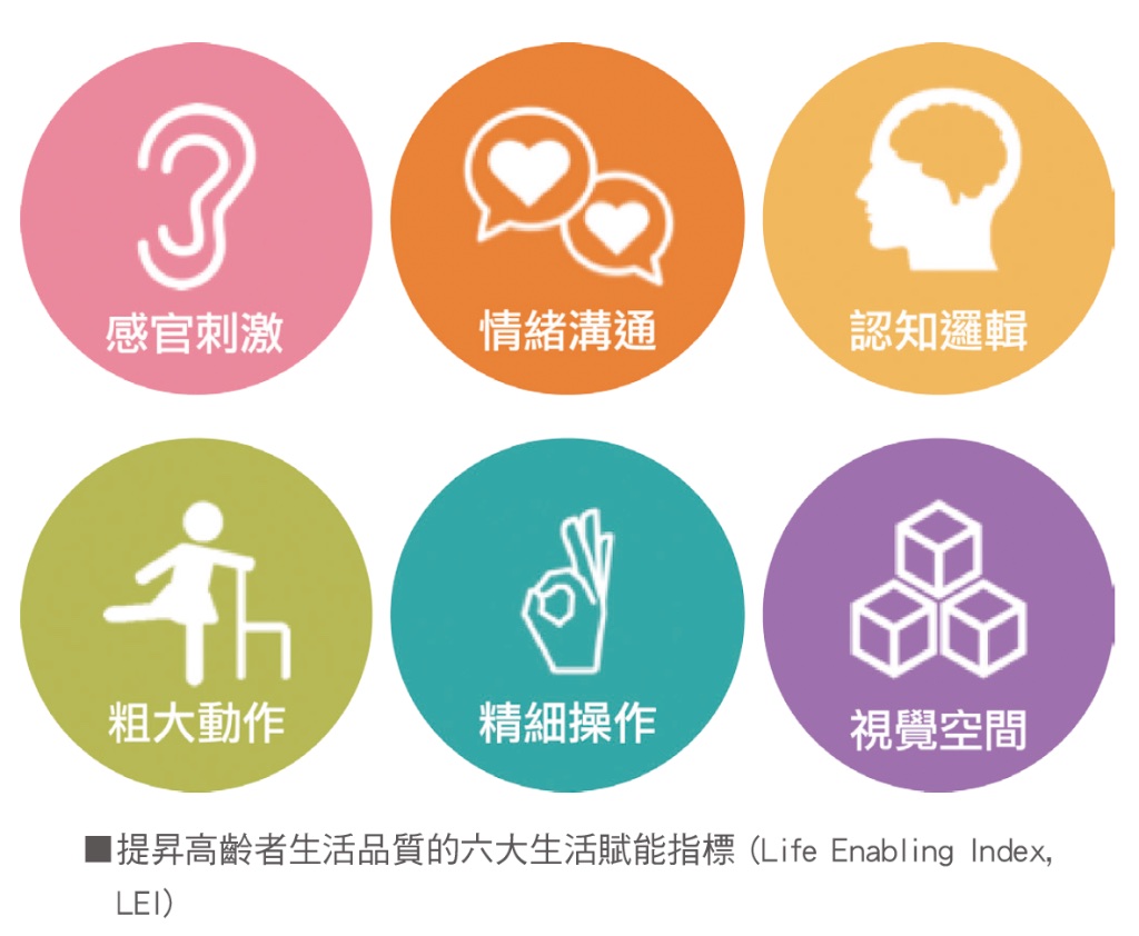 生活賦能® (Life Enabling)不只是恢復長輩的生活功能,更是從生理、心理、社會關係、環境的多元觀點,賦予長輩對生活的想像,找回更多生活的主導權。在此理念基礎下設計出的六大生活賦能指標(LEI),包含「感官刺激、情緒溝通、認知邏輯、粗大動作、精細操作、視覺空間」。