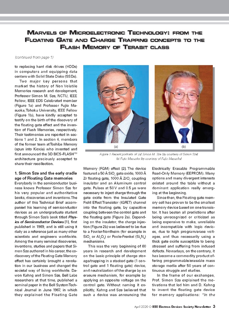 二0二0年全球意外飽受新冠肺炎病毒肆虐,人們生活行動與生命受到前所未有的威脅,生活型態大改變,在家工作、遠距教學、線上學習與會議在全世界盛行,紛紛被迫透過手機、平板電腦、筆記型電腦等電子產品來溝通。這些能在疫情期間發揮作用的電子產品,都需用到「浮閘記憶體」。此記憶體技術歸功世界級大師-國立交通大學終身講座教授施敏所發現的「浮閘記憶體效應」。國際電機電子工程師學會(IEEE)近期罕見以大篇幅首度介紹這技術對全球產業的貢獻,致使施敏大師再引起矚目。