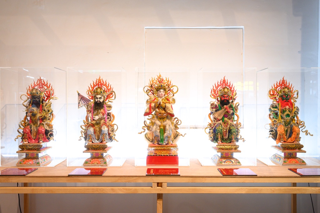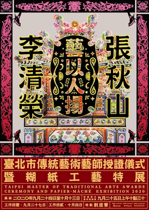 本府設立臺北市傳統藝術藝師獎,分工藝美術、表演藝術兩大領域,表揚設籍於臺北市之傳統藝術文化資產保存者或保存團體,獎項創立的基本精神為「藝以人揚」,糊紙技藝仰賴藝師個人藝術造詣與功夫,現年80歲的張秋山藝師為臺北糊紙老店「茂興齋」第三代負責人,擅長剪花以及屋宇的製作與裝飾,此次展出由茂興齋所製作在普渡場合使用的糊紙作品,立身土地山神與紙花剪黏都展現了老臺北的糊紙風采。現年62歲的李清榮出身糊紙世家,以所紮製人物、獸類作品的精巧多變而著名,此次為展覽特製的八仙尊像,更是臺灣糊紙界罕見的全新創作。