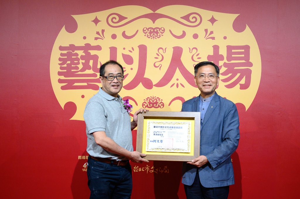 臺北市政府25日頒發屬於「臺北市傳統藝術」最高榮耀「藝師獎」榮銜予兩位新登錄傳統工藝「糊紙」保存者─張秋山及李清榮,並由臺北市蔡炳坤副市長親自授證頒獎,表揚兩位藝師畢生傳承糊紙工藝的貢獻,也為臺北市傳統藝術藝師陣容增添強而有力的生力軍。