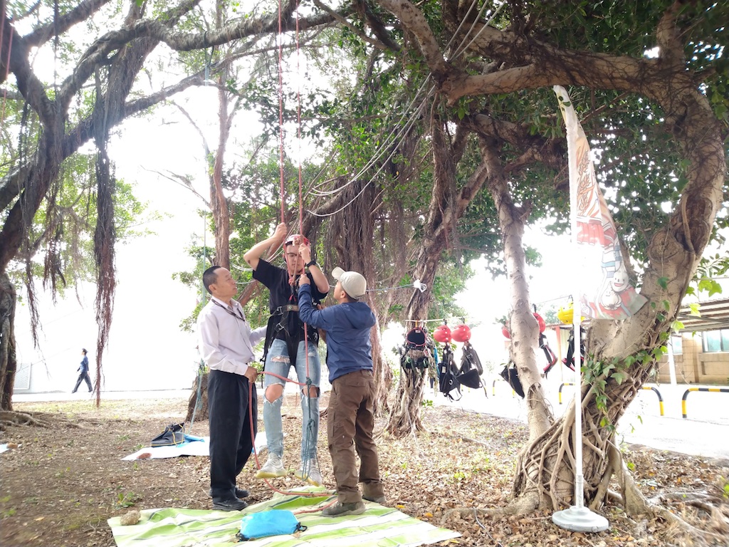 明新科大創校54週年,該校「休閒事業管理系」亦成立20週年,在校園大操場旁舉辦最夯的「攀樹」體驗