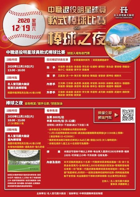 2020年12月19日星期六下午13:00至16:00,於名人堂花園大飯店龍潭兄弟棒球場進行退役明星球員軟式棒球賽,目前確定的球員名單如下:(依筆畫順序排列,球員陸續邀請中)