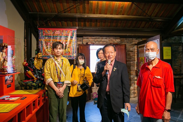 《千變萬華》特展紀錄萬華百年產業的故事,以影像、文字與作品精彩呈現。圖為百年佛具店「龍山佛具」第六代老闆李子勇現場導覽。