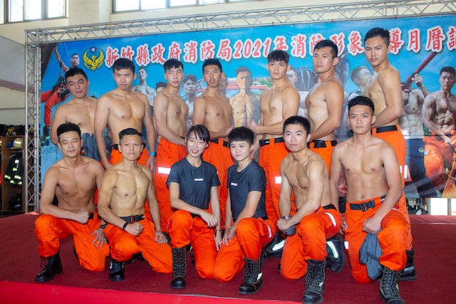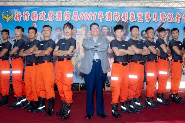 新竹縣消防局去年推出月曆造成轟動、民眾秒殺,今年再推出「2021年消防形象宣導月曆」,集結16位消防局外勤單位型男及美女,到本縣14個知名景點實景拍攝,限量3000份,28日開始民眾憑發票兌換。今(26日)消防局第一大隊暨竹北分隊舉辦月曆發表會,月曆主角亮相與民眾親切合照。